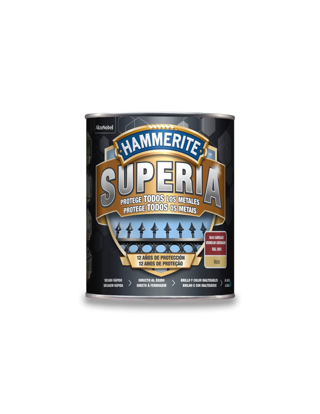 Hammerite Superia® é a nova geração de esmalte antioxidante à base de água, formulado para ser aplicado diretamente na ferrugem e diretamente em qualquer metal sem primer, proporciona um acabamento decorativo duradouro de até 12 anos de proteção. Hammerite Superia®, acabamento fosco, proporciona uma aparência fosca suave a grades, grades, portões e todos os objetos feitos de qualquer tipo de metal, principalmente ao ar livre. Proteção avançada contra corrosão. Até 12 anos. Proteção extrema em condições climáticas adversas e contra a radiação UV. Fácil aplicação em todos os metais, sem necessidade de primer. Secagem rápida, duas demãos em um dia. Com tecnologia de bloqueio de cores: brilho e cor inalterável.